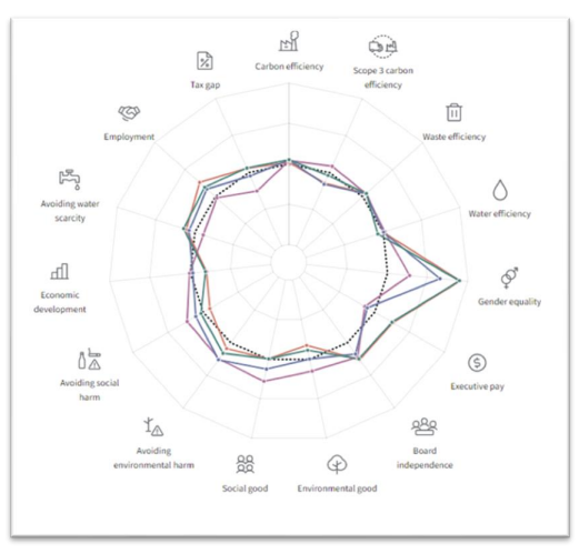The image below from Impact Cubed’s platform shows a sampling of these funds and how they outperform the benchmark (dotted line) on gender equality. In other words, these strategies are doing what they say on the tin based on factual data about companies’ gender diversity on board and senior management – rather than including firms just based on their inclusion policies. The beauty of marrying tech tools with factual ESG data (rather subjective, aggregated ESG scores or ratings) is that investors can validate a strategy, compare funds, and view raw data on all underlying holdings in a few simple clicks.