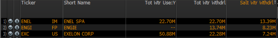 We can see here that Exelon corp. report three different water numbers. One is for Total Water Use, including presumably every litre of water used, including recycled water; Total Water Withdrawal, which describes only the amount they have withdrawn externally to be used in their operations; and Saltwater Withdrawal that describes how much of that water is withdrawn from the ocean for cooling purposes and thus not competing with other industrial, residential, or agricultural uses.
