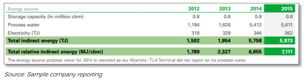 ESG information including water information is often published in PDF files that are not easily searched and categorized. For example, in the table below, both machines and humans might read that the company used 5611 million cubic metres (cbm) of process water in 2015, while the actual unit of the table refers to energy use related to processing water, not water use per se.
