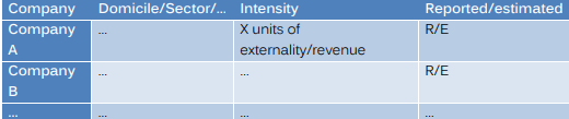 The outcome of step two is to have data on how different companies are exposed to a particular externality via different business activities. We argue that one should have a data set that is as granular as it is meaningful when describing companies’ exposure to different products and services expressed in revenue to accurately estimate their contribution to the externality at hand.