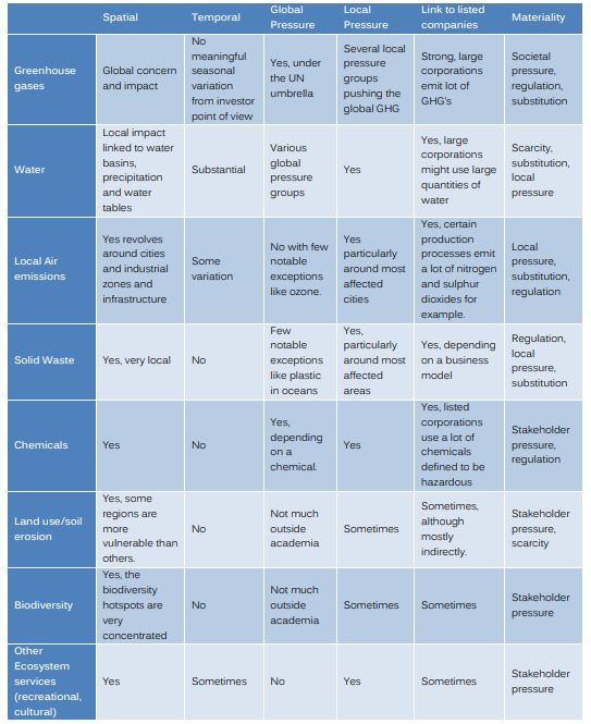 The table on the following page summarizes the basics of this as applied to the main externality types and can be used as a base structure to help guide investors in establishing their own materiality matrix.
