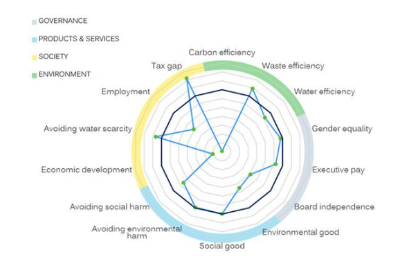 The figure below shows the performance of an ESG-marketed fund (the jagged blue line with green points) relative to its benchmark (the solid navy circle) on quantitative, observable ESG factors. The fund is worse than the benchmark on 11 of the 14 factors and has a net impact of −15 bps of tracking error. In other words, the fund deviated from the benchmark in ways that created a net negative impact.